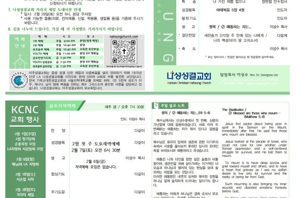 January 31, 2026 Posted By: manager 교회 소식1. 환영 및 감사 | 주일 예배에 오신 여러분을 주님의 이름으로 환영합니다. 오늘 점심은 캄보디아에 계시는 한미경 집사님께서 섬겨 주십니다. 감사를 드리며, 매주일 점심식사를 준비해 주시는 성도님들께도 감사드립니다. 2. 2월 정기당회 | *일시: 2월 1일(오늘) 오후 1시, 당회실 3. LA지방회 서감찰회(감찰장 한천영 목사) 모임 | *일시: 2월 1일(오늘) 오후 3시...