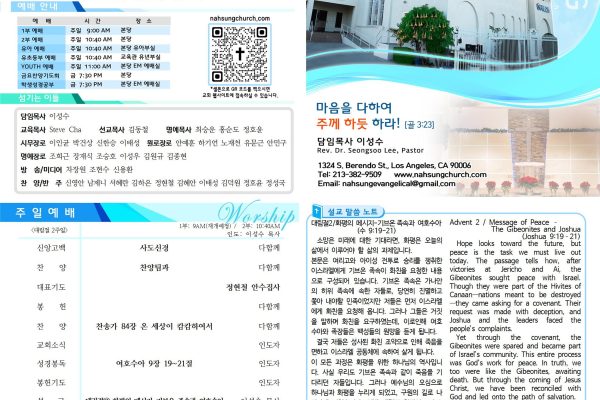 November 29, 2025 Posted By: manager 교회 소식1. 환영 및 감사 | 거룩한 주일 예배에 오신 여러분을 주님의 이름으로 환영합니다. 점심식사 준비를 위해 수고해 주시는 성도님들께도 감사드립니다. 2. 2025 대림절(Advent) 시작 안내 | * 예수님의 탄생과 다시 오실 예수님을 기다리는 대림절이 11월 30일(오늘)부터 12월 21일(성탄주일)까지 진행됩니다. 이 땅에 평화의 왕으로, 또한 만인의 구세주로 오신, 다시 오실 예수님을...