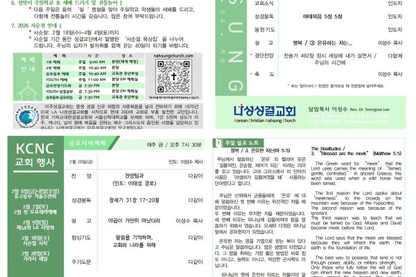 February 14, 2026 Posted By: manager 교회 소식1. 환영 및 감사 | 주일 예배에 오신 여러분을 주님의 이름으로 환영합니다. 오늘 점심은 이성우 장로님께서 섬겨 주십니다. 감사를 드리며, 매주일 점심식사를 준비해 주시는 성도님들께도 감사드립니다. 2. 제54회 엘에이(LA) 지방회 임원 | *회 장: 이병억 목사(뉴송교회) *부회장: 이진경 목사(임마누엘선교교회) / 허요한 장로(하와이갈보리교회) *서 기: 이성수 목사(나성성결교회) *회 계: 조동환 장로(행복한우리교회)...
